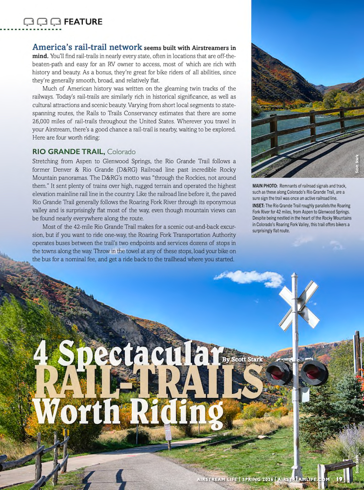 4 Spectacular Rail-Trails Worth Riding Much of American history was written on the gleaming twin tracks of a railway, and today’s rail-trails are often similarly rich with historical significance, cultural attractions, and scenic beauty. And since the railway engineers of yesteryear generally pursued the gentlest slope available, rail-trails are often a recreational cyclist’s dream: smooth, broad, and relatively flat. [read partial]